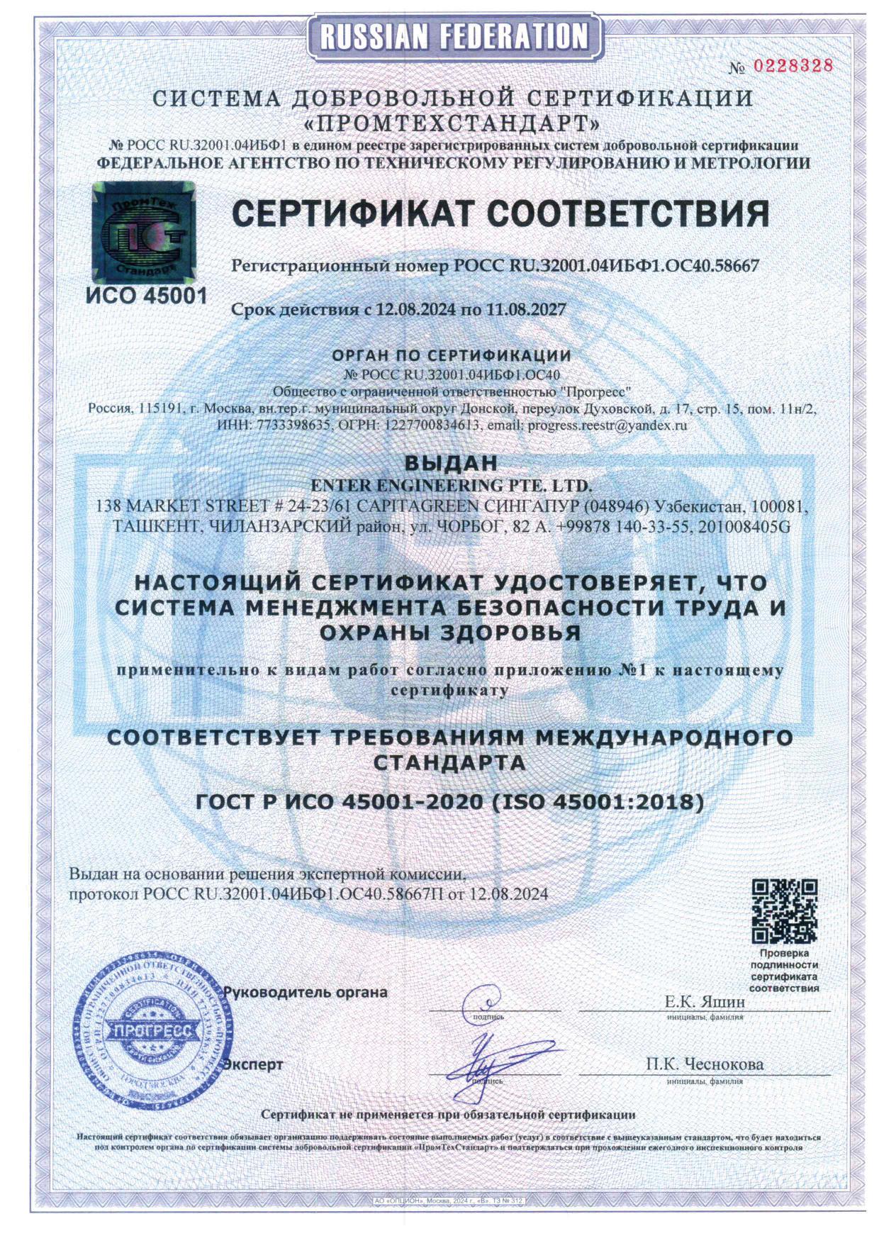 Сертификат: Protection of labor conditions and occupational safety this OHSAS 45001 (RU)